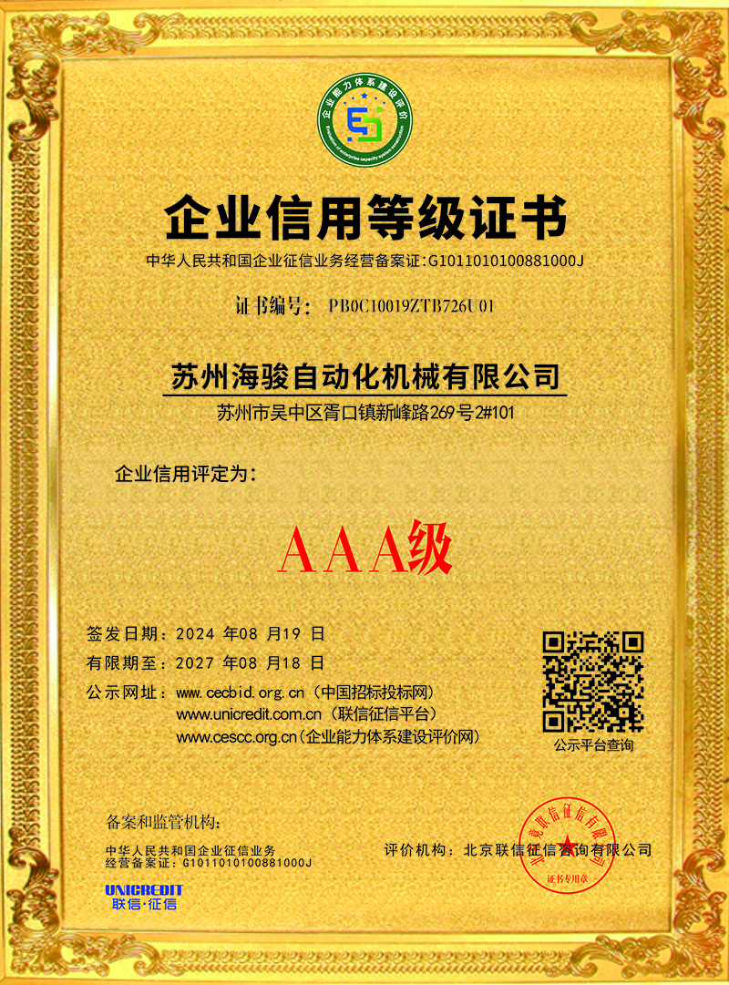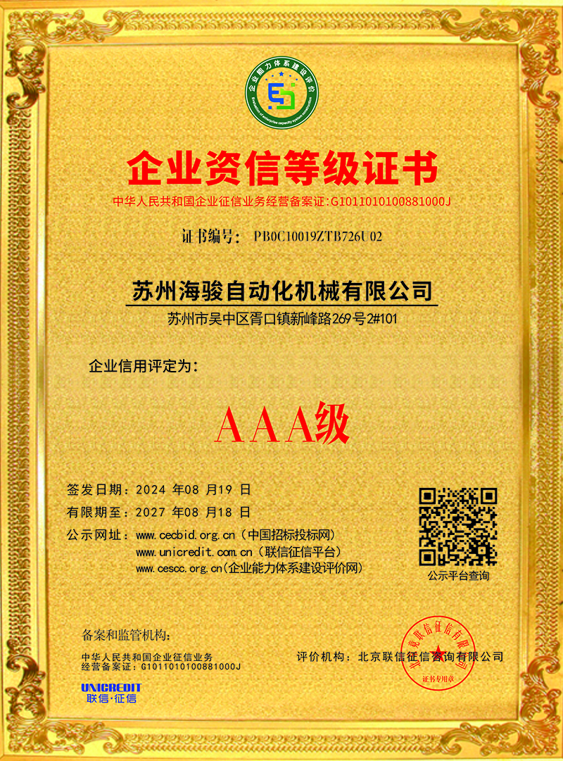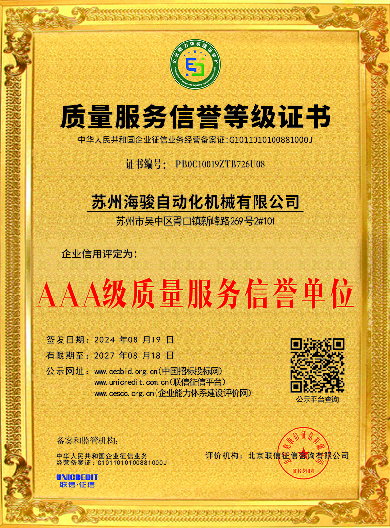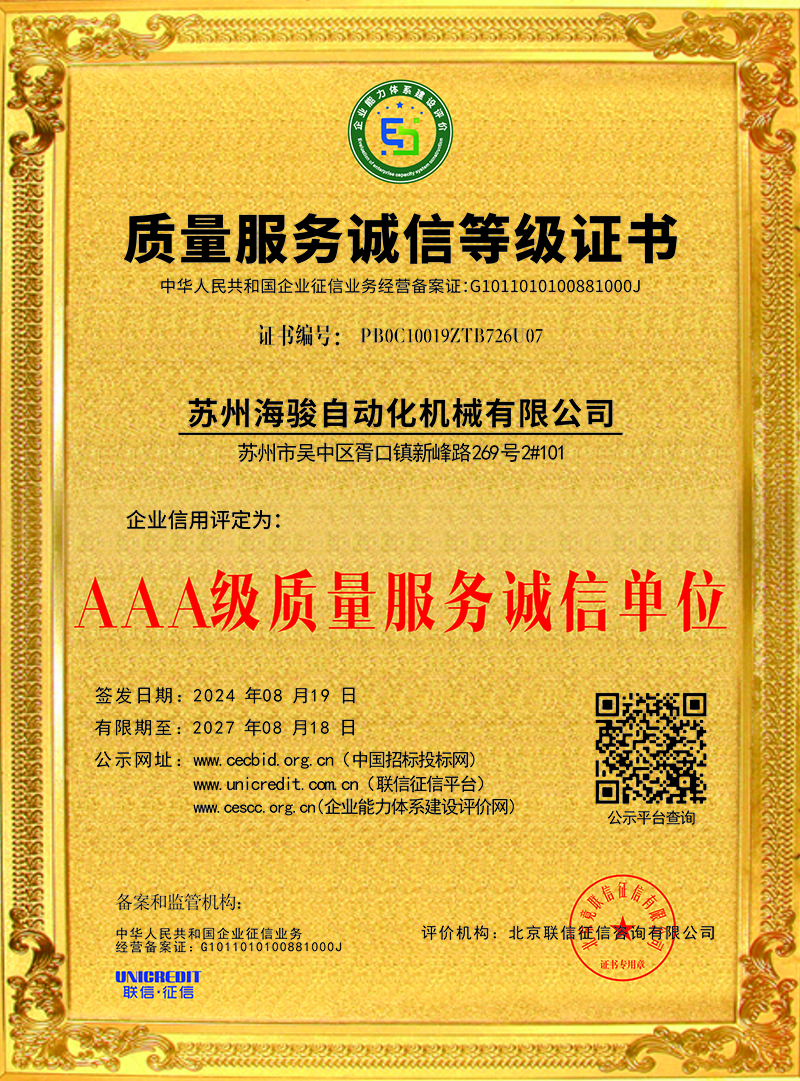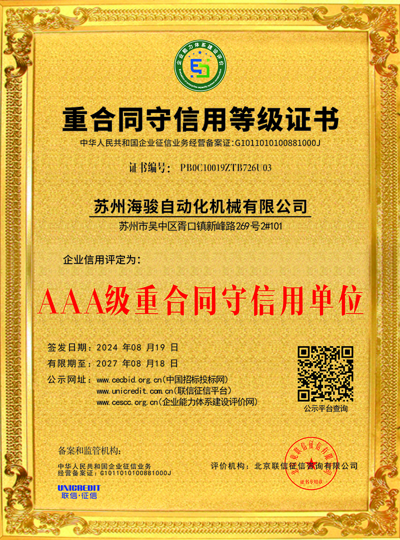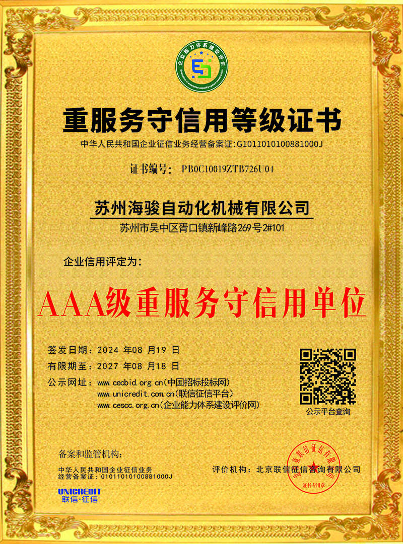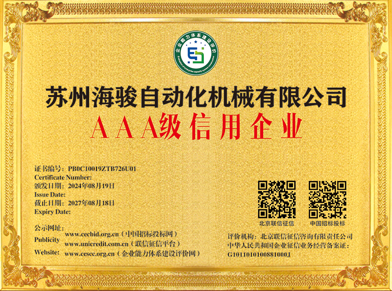 蘇州海駿自動(dòng)化機(jī)械有限公司的誠信、實(shí)力和產(chǎn)品品質(zhì)質(zhì)量獲得了業(yè)界的認(rèn)可!同時(shí)也被工商部門評(píng)為 “重合同、守信用”單位,歡迎各界朋友蒞臨蘇州海駿自動(dòng)化機(jī)械有限公司參觀指導(dǎo)和業(yè)務(wù)洽談。